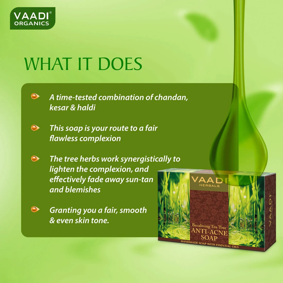 With a high concentration of anti-microbial agent, terpinen-4-ol, tea tree oil makes this soap, extremely effective against acne. It rids the surface of dirt, germs & excess sebum. It even unclogs pores and relieves skin congestion; granting you freedom from acne worries!